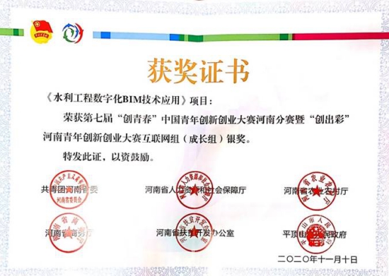 1月8日,第七届“创青春”中国青年创新创业大赛河南分赛暨“创出彩”河南青年创新创业大赛颁奖仪式在郑州举行。中共平顶山市委副书记葛巧红,共青团河南省委副书记袁浩,省人社厅就业促进局一级调研员李新民等领导出席颁奖仪式,来自全省各行业、各领域获奖的项目代表参加仪式。大赛设商工、农业农村、互联网3个类别,启动以来,吸引了全省1250个项目参赛,在100个进入决赛的项目中评出金奖、银奖、铜奖各9个。永利官网水利工程学院选送的《水利工程数字化BIM技术应用》项目喜获互联网组(成长组)银奖。