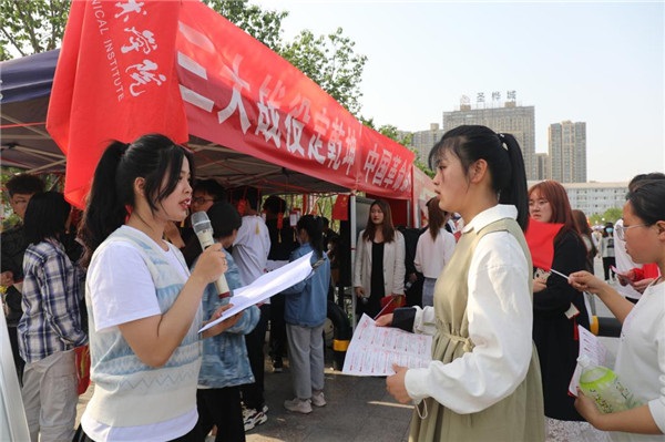 实践活动围绕中国共产党百年发展历史的重要节点设置故事线,在校园中设置12块党史知识展板和12个活动站点。活动分为两部分,一是学习百年党史答题活动,学生手持印有党史知识题目的答题卡,从扬帆广场第一站出发,每到达一个站点,先学习站点设置的党史知识内容,然后进行答题,答对者可获得一枚答题通关印章;二是感悟伟大历程实践活动,各个站点结合不同历史时期组织开展内容丰富、形式多样的学党史实践活动,学生按照活动项目要求完成任务后,可获得一枚活动通关印章。最终,学子们根据获得的通关印章数可以换取相应的礼品。活动现场彩条飘扬、人影穿梭、气氛热烈,学子们个个热情高涨,在“青春心向党 祝福颂祖国”终点站纷纷在许愿处为党的百年华诞、为伟大祖国送上美好祝愿。