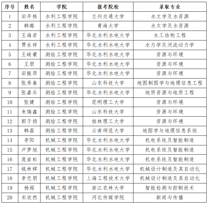 近日,2021年全国硕士研究生录取结果陆续揭晓,永利官网与华北水利水电大学联办的本科2021届毕业生考研捷报频传,20名学生顺利考取华北水利水电大学、兰州交通大学、昆明理工大学等高校硕士研究生。