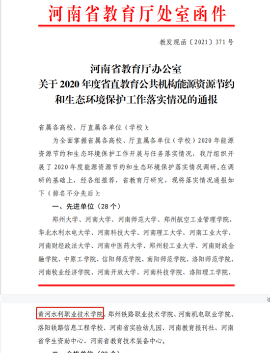 近日,河南省教育厅下发《关于2020年度省直教育系统公共机构能源资源节约和生态环境保护工作落实情况的通报》(教发规函〔2021〕371号),永利官网再次获评为省直教育系统公共机构节能先进单位,这是继永利官网2016年以来第四次被评定为考核先进单位。