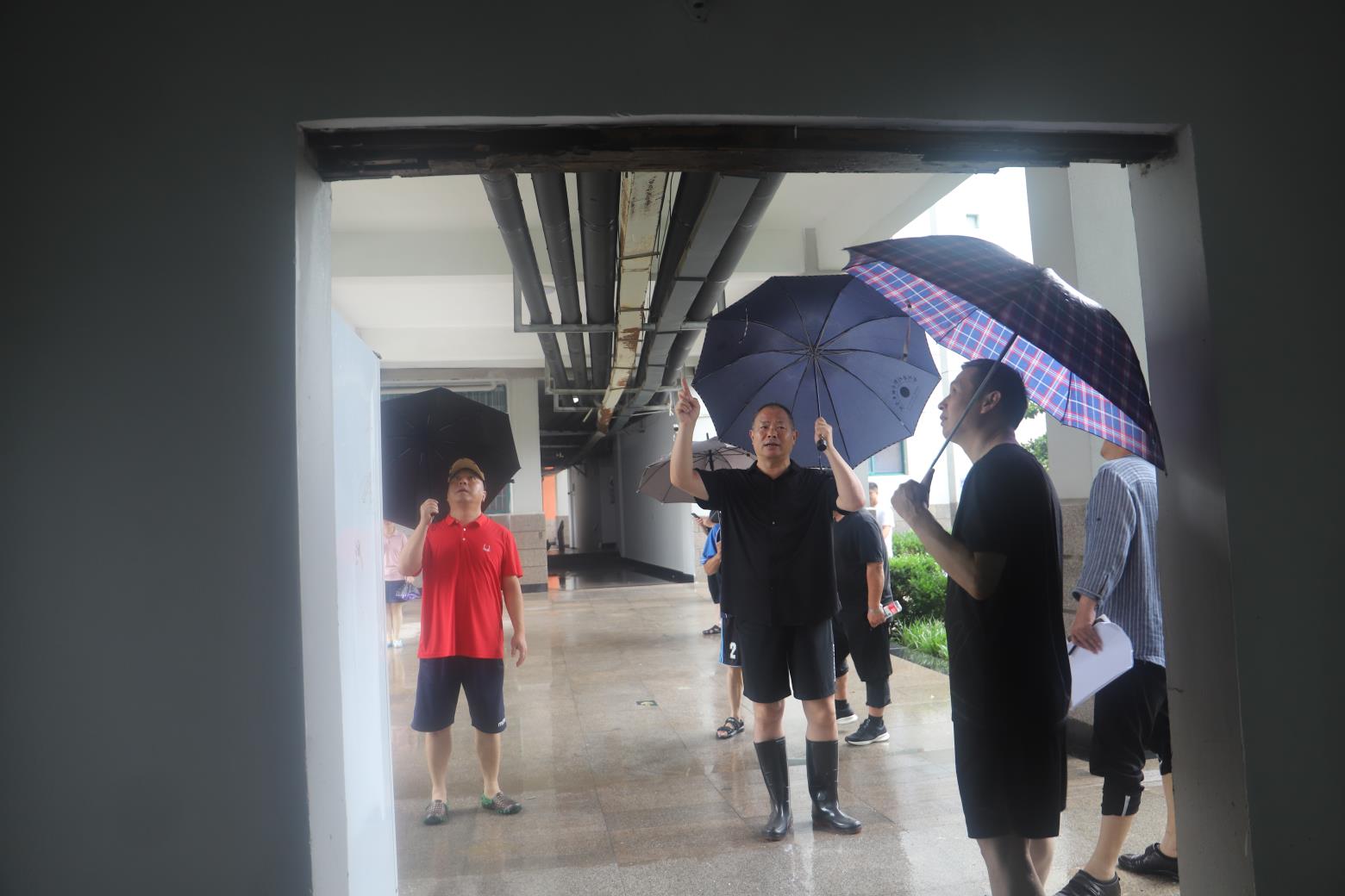 检查组一行分别来到教学楼及各实训场馆,对电气设备、排水通道、楼道伸缩缝、校园湖泊等处进行了深入、细致的检查,重点对建筑整体防水、内部防渗、实训室设备、地下管线等安全隐患进行了全面排查。