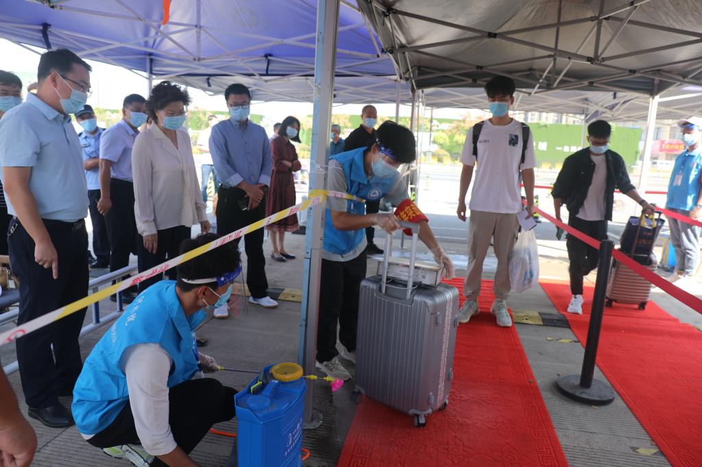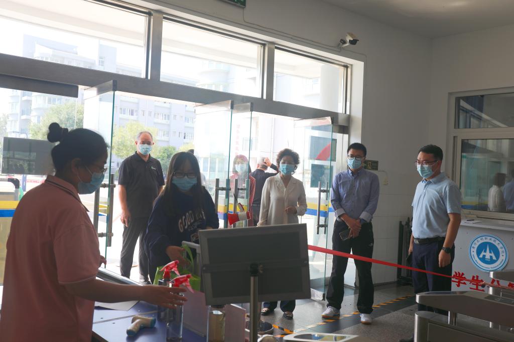 校领导一行依次来到北门入校通道、身份核验点、学生宿舍、学生食堂、留观区等地检查指导,了解各站点实时情况。在北门入校通道处,校领导细致察看学生返校疫情防控的各个环节,现场对行李消毒、登记报到等环节提出优化方案。在学生宿舍,校领导与返校学生亲切交谈,对他们的到来表示欢迎,叮嘱他们做好防护工作,尽快投入学习生活。