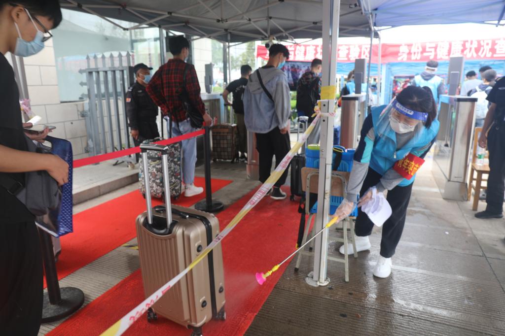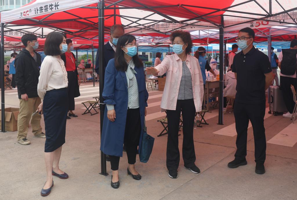 校领导一行仔细察看新生进校行李消杀、体温检测、身份查验、扫码验证、核酸检测、签到注册等流程,了解各站点实时情况,对一线工作人员进行了亲切慰问,并要求相关部门要提高站位、高度重视、落实责任,切实加强疫情防控措施,规范新生入学工作各环节流程,为新生提供优质保障,确保新生入学报到工作安全、圆满完成。