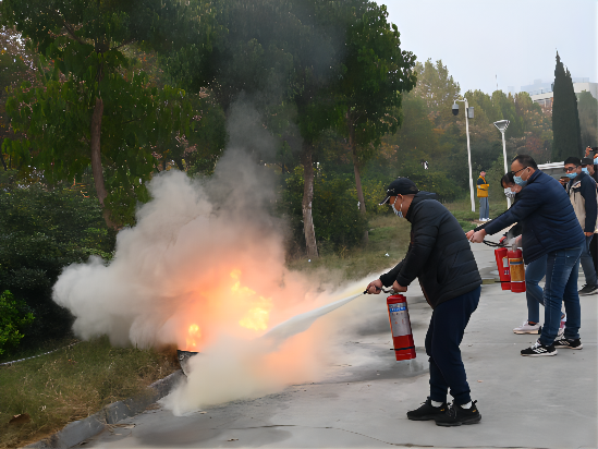示范区消防救援大队教官李楠讲解实训室防火的相关知识和干粉灭火器的使用方法,并现场进行示范操作。随后,全体参训人员分组依次进行灭火实战演练,巩固培训成效。