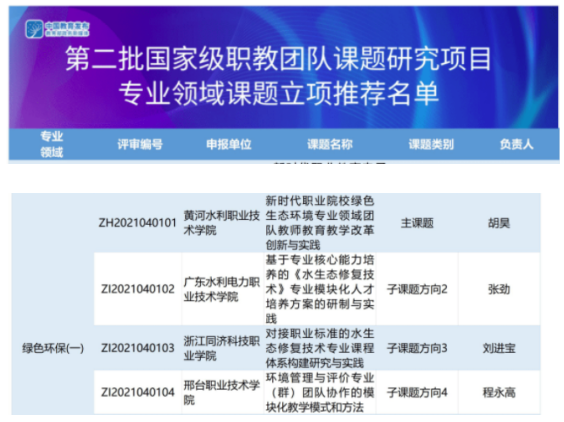 11月24日,教育部公示了第二批国家级职业教育教师教学创新团队课题研究项目遴选结果,由永利官网牵头组织,校党委副书记、校长胡昊主持的《新时代职业院校绿色生态环境专业领域团队教师教育教学改革创新与实践》重点课题成功入选。