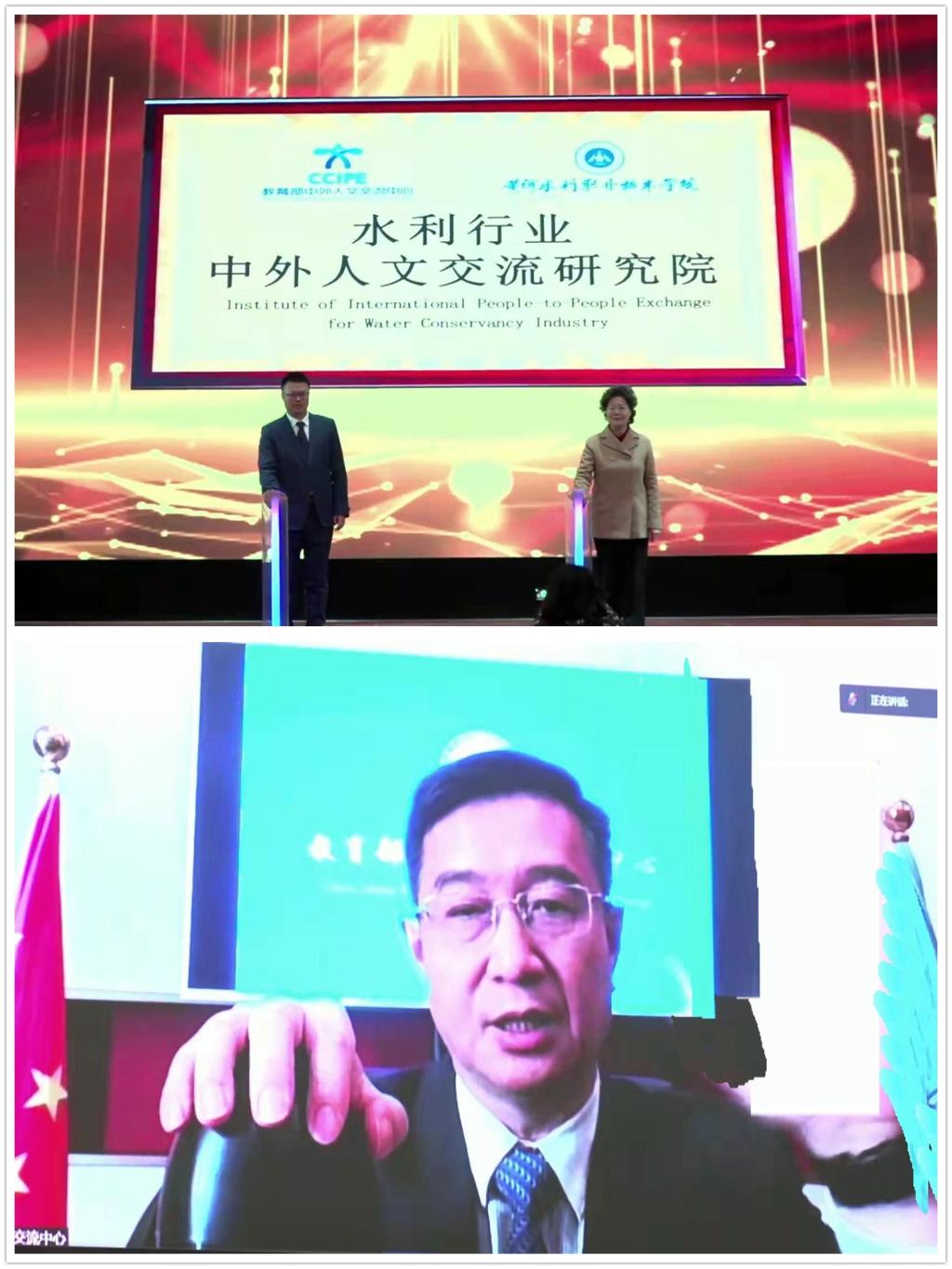 校党委书记周保平、校长胡昊,教育部中外人文交流中心主任杜柯伟共同为水利行业中外人文交流研究院进行网络云揭牌。