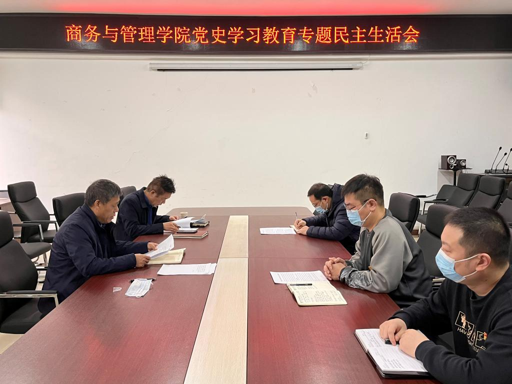 商务与管理学院党总支书记樊建科围绕主题,汇报了学院班子党史学习教育、为群众办实事的情况,汇报了为开好党史学习教育专题民主生活会征求意见情况,重点从5个方面查找了领导班子存在的差距和不足,深刻剖析了原因,明确了下一步努力方向。樊建科、党总支副书记邹新忠、副院长吕梁依次结合自己的学习、工作情况作对照检查和自我批评,其他同志对汇报者逐一提出批评和建议。每个人的汇报做到了三个摆进去,查找问题不遮掩、不回避、不护短,反思剖析见思想、见政治、见作风,相互批评直截了当,真点问题、点真问题。