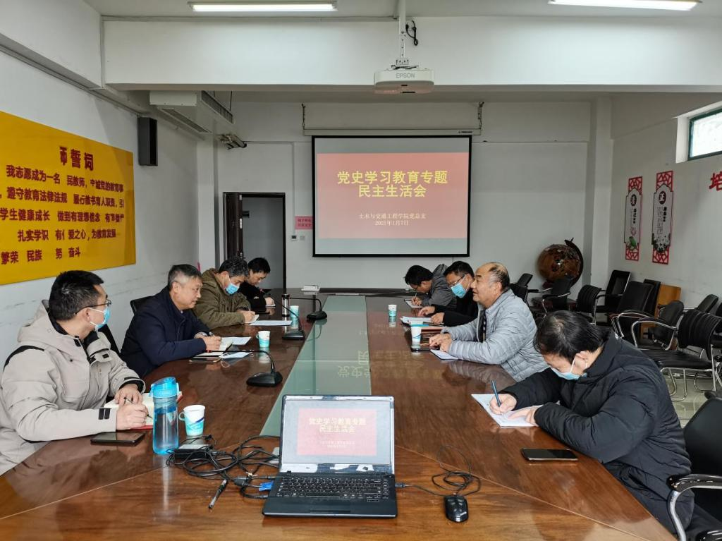 1月7日下午,土木与交通工程学院党总支在实训馆5330会议室召开领导班子党史学习教育专题民主生活会。副校长刘玉宾,学院领导班子成员及有关干部群众代表参加会议,会议由土木与交通工程学院党总支书记赵杰主持。