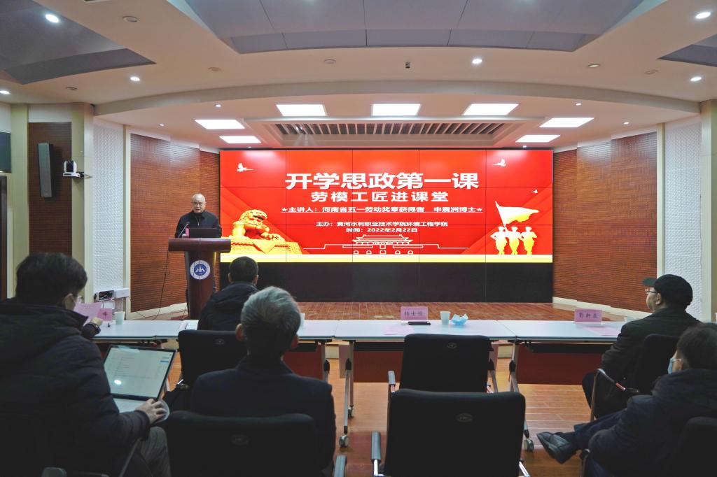 为深入贯彻落实习近平总书记关于教育的重要论述和全国教育大会精神,全面推进课程思政建设,不断提高人才培养质量,帮助青年教师和大学生树立科学探索、追求真理、勇于创新的奋斗精神,2月22日,环境工程学院特邀河南省五一劳动奖章获得者申震洲博士为全院师生做“开学思政第一课·劳模工匠进课堂”主题报告。党委副书记、工会主席杨士恒出席报告会,党委宣传部部长彭新立,环境工程学院全体教师参加线下报告会,全体学生线上参会。报告会由环境工程学院院长冯峰主持。