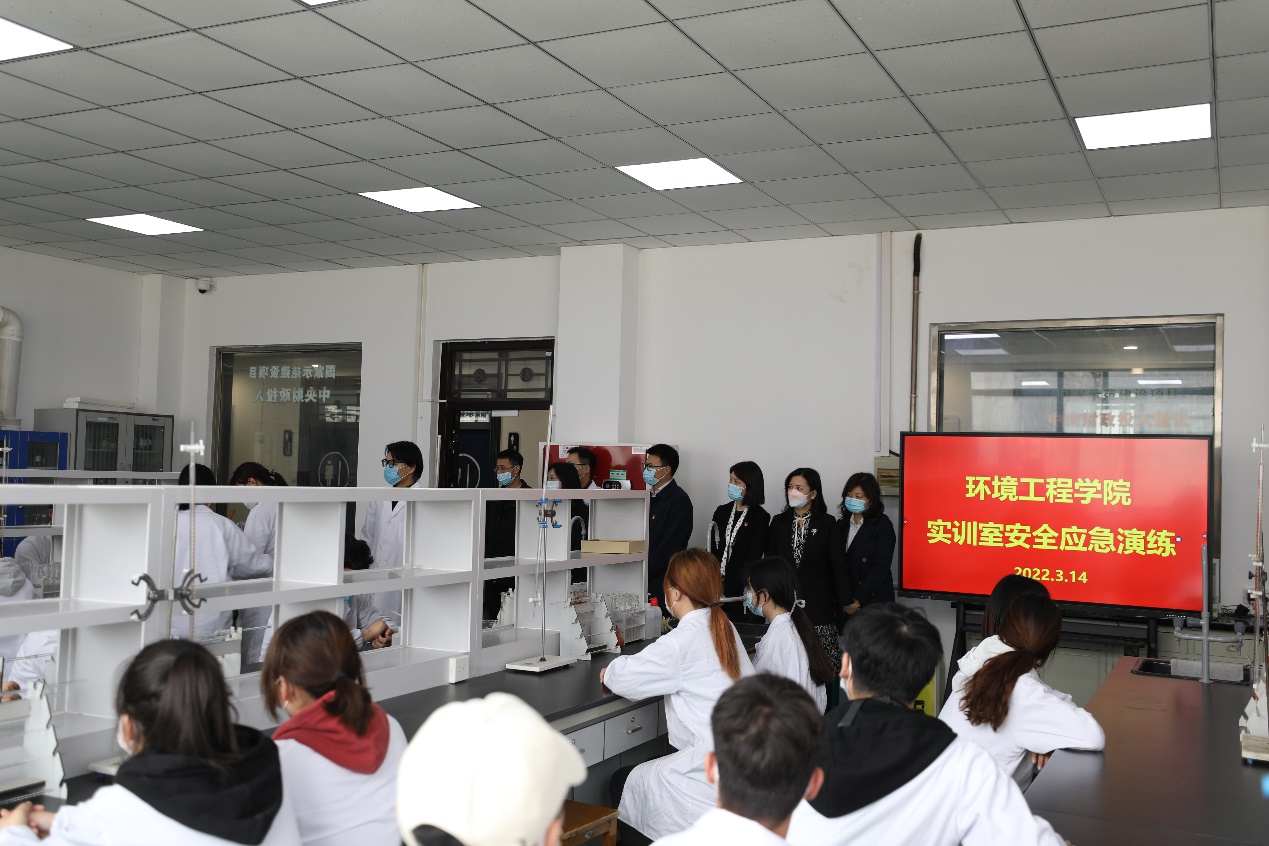 为进一步深入贯彻《教育部关于加强高校实验室安全工作的意见》等文件精神,落实永利官网实训室安全管理规定,增强永利官网师生对危化品使用及火灾扑救等工作的应急处理能力,3月14日下午,环境工程学院在8号实训馆开展实训室安全应急演练工作。校党委副书记、校长胡昊,副校长焦爱萍现场指导应急演练工作,教务处、教育教学督导室、环境工程学院等负责人,环境工程学院实训中心负责人、授课教师、61名环境监测技术学生等参加了演练工作。