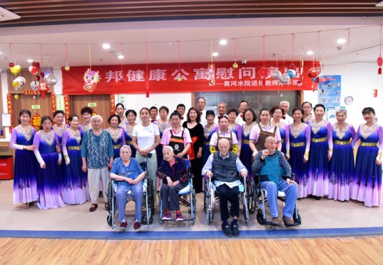 演出结束后,全体演职人员与养老院老人一起合影留念。让他们多留下欢乐,减少些病痛,这是黄河水院退休教师声乐班服务社会,为老年人送温暖的公益活动,为实现每个老年人都能老有所养,老有所依,老有所乐贡献出自己的绵薄之力。祝福我们的祖国繁荣昌盛,祝愿老人们晚年生活绚丽多彩。
