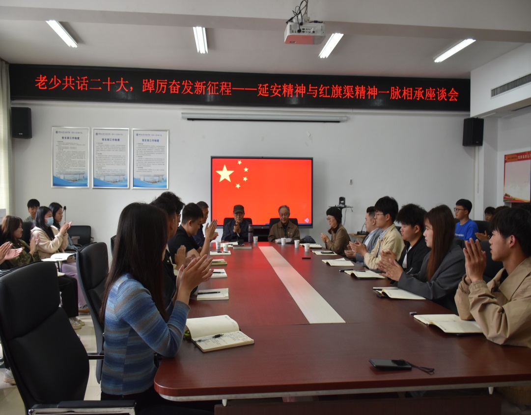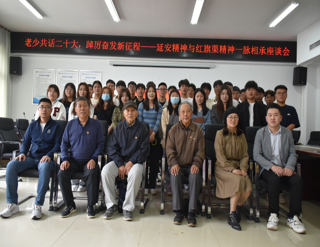5月6日上午,学校退休老党员、老干部、老教师郑乃明、白济民在商务与管理学院党员活动中心与商管院师生代表共话党的二十大,以yl8cc永利官网发展为例,就习近平总书记关于延安精神与红旗渠精神是一脉相承的重要论述进行座谈,勉励教师和青年学生继承和弘扬延安精神和红旗渠精神,踔厉奋进新征程,将人生梦想融入中华民族伟大复兴的中国梦,不懈努力,勇攀高峰。参加座谈会的还有离退休党总支书记李少春,商管院党总支书记樊建科、副书记邹新忠,学院“双带头人”程云翔,代理分团委书记肖星野,骨干教师田丰,红旗渠精神传承人秦晨凯等。
