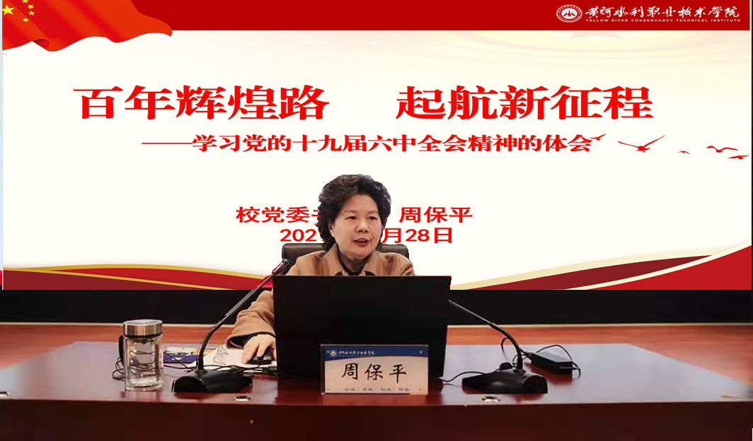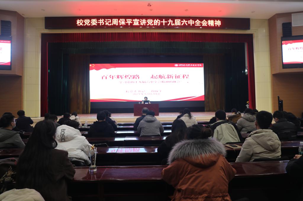 12月28日下午,校党委书记周保平以《百年辉煌路 启航新征程——学习党的十九届六中全会精神的体会》为题,宣讲党的十九届六中全会精神。各学院党总支书记、机关党总支第一党支部、辅导员代表等聆听了宣讲。