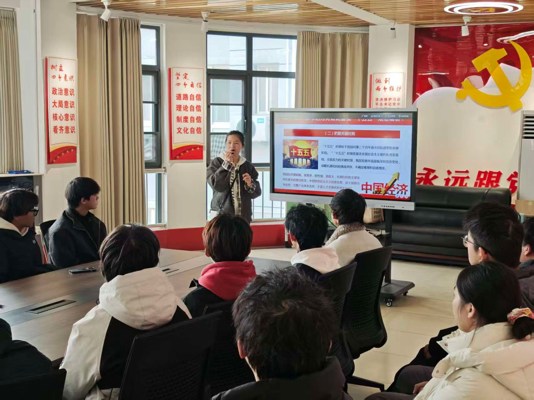 会上,母延雪紧密围绕全会精神,为同学们梳理了会议召开的时代背景,并结合当前国际国内形势进行了深入剖析。她号召大家要将全会精神内化于心、外化于行,把个人的“小目标”融入国家的“大蓝图”,勉励同学们要珍惜青春时光,练就过硬本领,在即将到来的“十五五”建设浪潮中,展现青春风采,贡献青春力量。