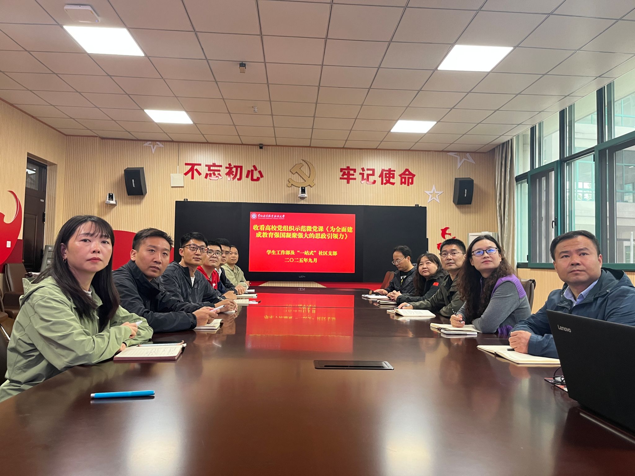 9月19日下午,学生工作部及“一站式”社区支部全体党员在JX5111集体收看高校党组织示范微党课《为全面建成教育强国凝聚强大的思政引领力》,深入学习领会微党课精神实质,探讨新时代学生思政工作的新思路新举措,凝聚推动教育强国建设的思政力量。