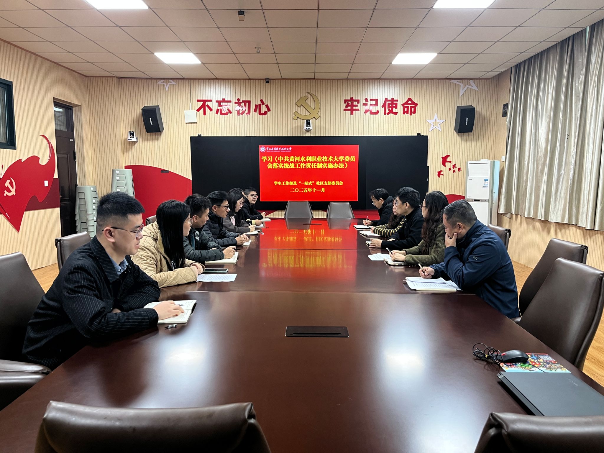 为深入贯彻落实新时代党的统一战线工作要求,切实把统战工作责任制落到实处,11月6日,学生工作部及“一站式”社区支部组织全体党员在JX5111深入学习《中共黄河水利职业技术大学委员会落实统战工作责任制实施办法》(以下简称“实施办法”),并结合学生工作实际探讨落实路径。会议由支部书记商坤主持,支部全体党员参加学习并展开热烈讨论。