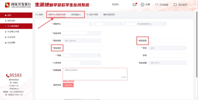 核实资助中心和就学信息,确保所填院系名称、专业名称、学号等准确无误。“院系名称”为学院全称,如果学院信息变更,则要填写现在所在学院的规范名称。