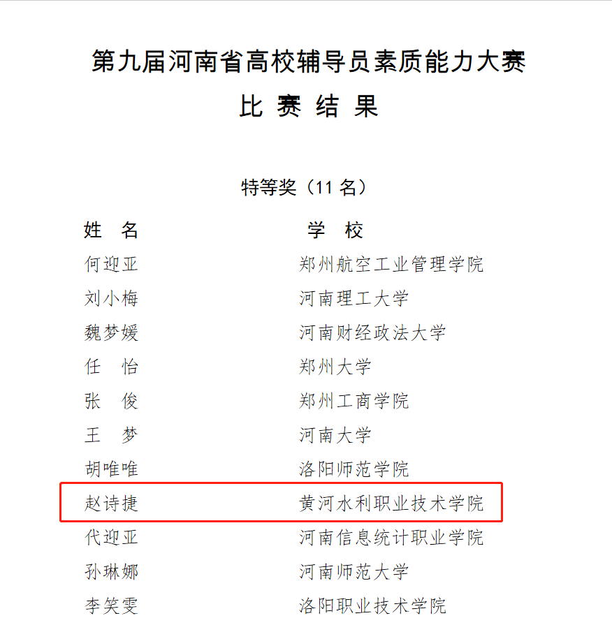 4月27日-5月11日,第九届河南省高校辅导员素质能力大赛在河南理工大学举行,来自全省130所高校的133名选手参赛。永利官网水利工程学院辅导员赵诗捷凭借昂扬的精神风貌、扎实的业务功底、缜密的逻辑思维、出色的语言表达及过硬的综合能力,一路过关斩将,最终荣获大赛特等奖,其优异成绩在全省高职院校中位列第一。