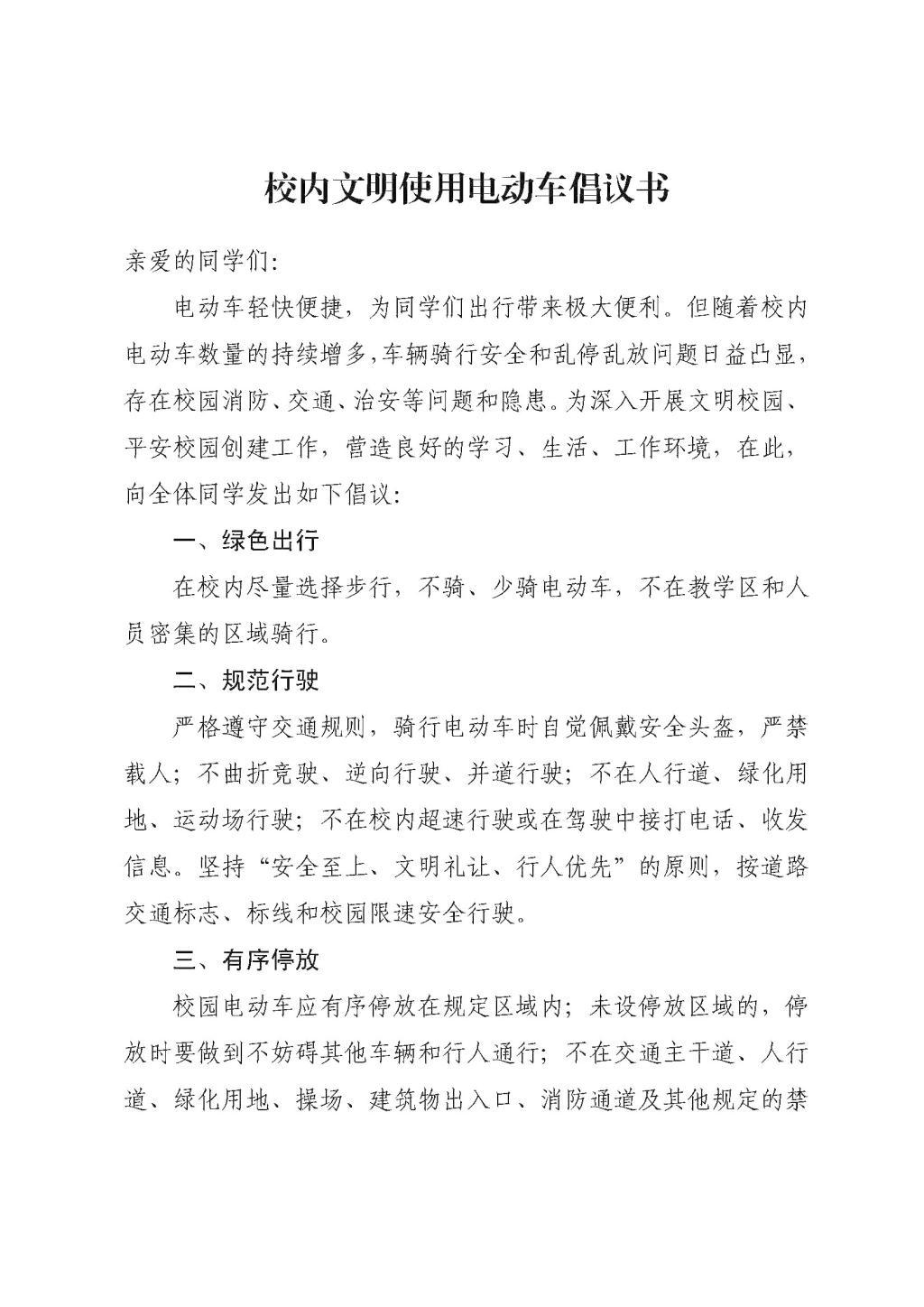 校内文明使用电动车倡议书