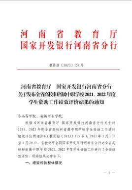 近日,河南省教育厅 国家开发银行河南省分行下发《关于发布全省高校和省属中职学校2021、2022年度学生资助工作绩效评价结果的通知》(教资助〔2023〕157号),永利官网获评全省高校2021、2022年度高校学生资助工作绩效评价“优秀”等级。