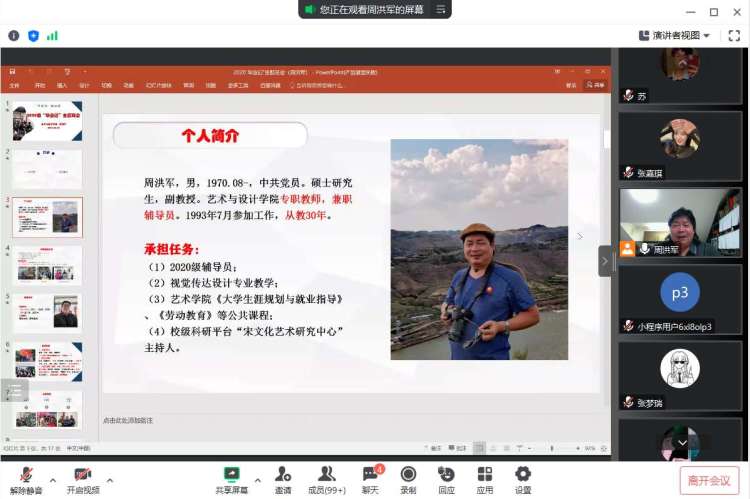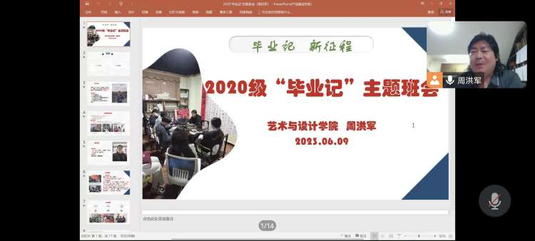 六月,是夏季正当时,也是青春散场,毕业在即。毕业季,向夏风许愿,在山海相见。愿此去繁花似锦,再相逢依然如故。2023年6月5日,艺术与设计学院20级辅导员周洪军老师召开了“毕业记,新征程”线上主题班会,全体同学在线参与。