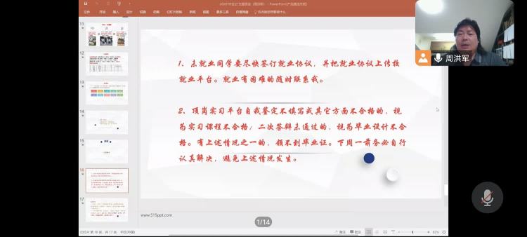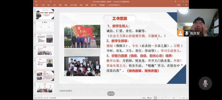 本次会议,周洪军老师从两个方面展开,首先回顾了这三年的时光,辅导员周洪军老师教学的核心理念:家的概念、亲如一家。把教学理念落实到每个班级,每个学生,用自己的方法去帮助同学,关心同学,使我们感受到家的温暖。三年的相处使我们亲如一家,三年疫情,聚少离多,使校园生活具有别样性和纪念意义。