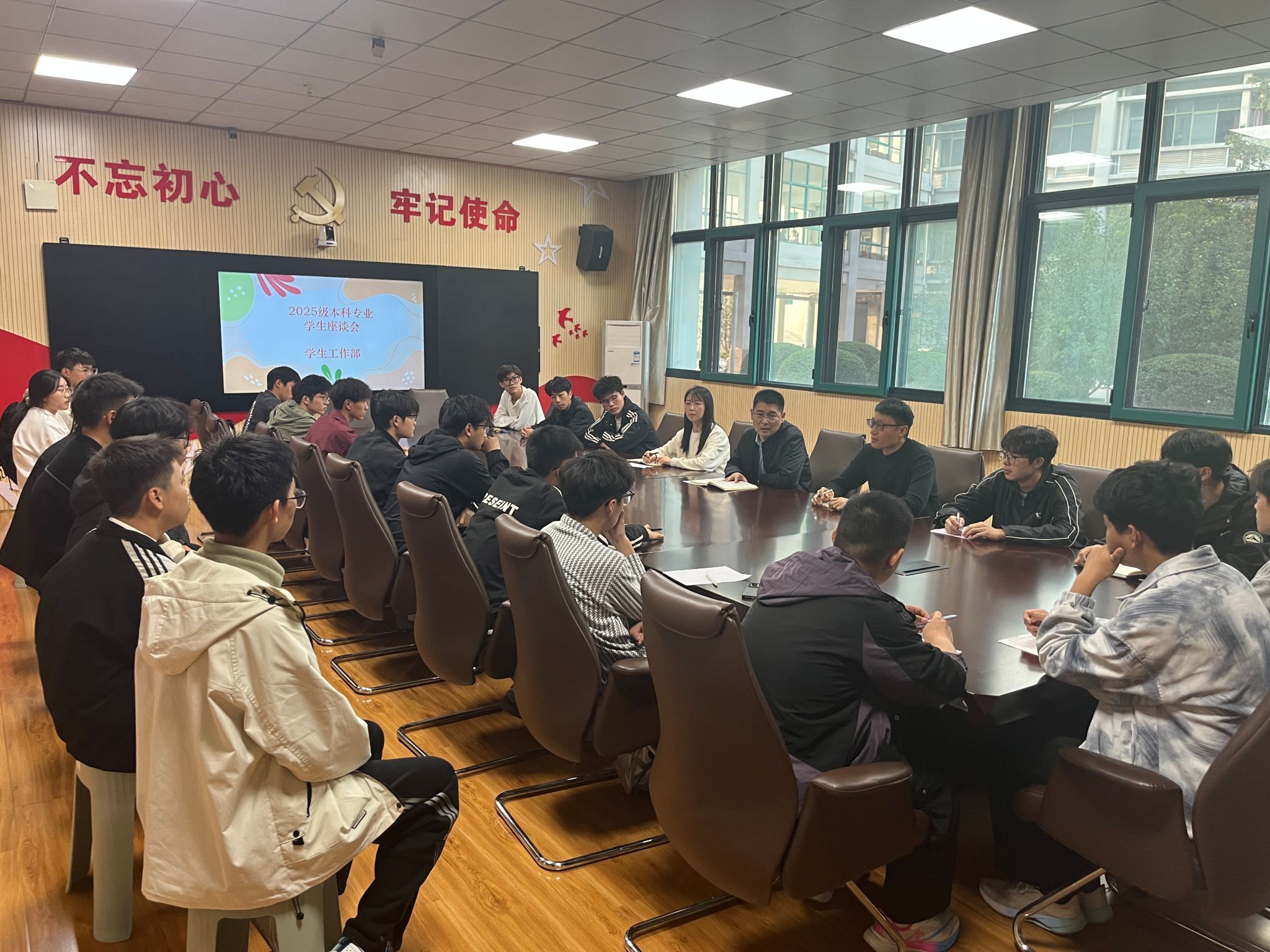 10月14日,学生工作部在JX5111召开2025级本科专业学生座谈会,了解首届本科专业学生的学习感受、成长需求。学生工作部部长商坤、心理健康教育中心主任刘娟、思想政治教育科科长闫治宇和2025级本科班班干部参加座谈。