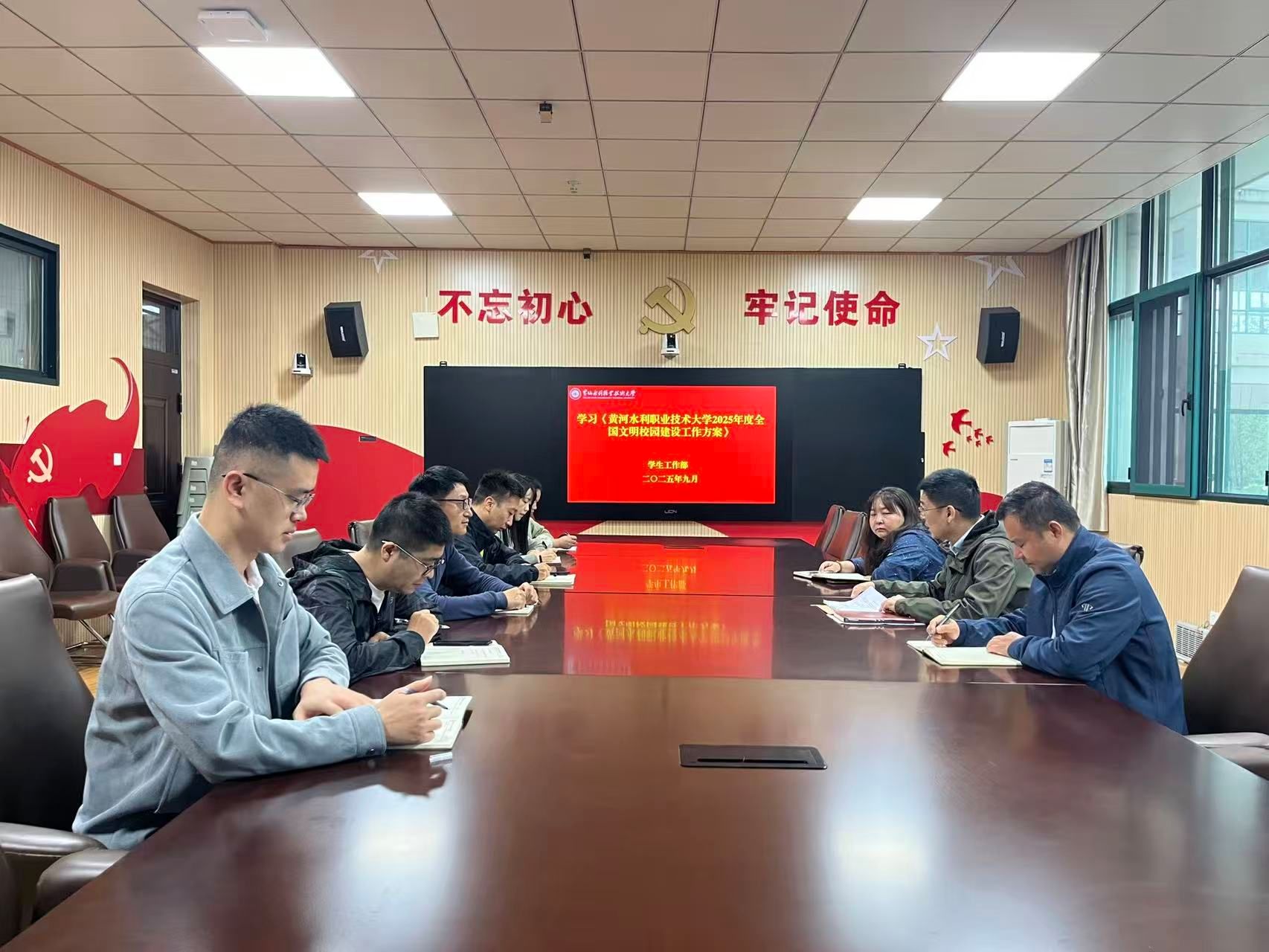 随后,会议聚焦《黄河水利职业技术大学2025年度全国文明校园建设工作方案》。商坤对方案进行了详细解读,从文明校园建设的指导思想、总体目标、主要任务到具体实施步骤,都进行了深入剖析。他指出,全国文明校园建设是学校提升综合实力、树立良好形象的重要举措,也是培养学生全面发展、营造优良育人环境的有效途径;并要求全体成员要积极参与校园文化建设,组织开展丰富多彩的校园文化活动,弘扬社会主义核心价值观,培养学生的文明素养和道德品质。同时,要加强学生日常行为管理,引导学生养成良好的学习和生活习惯,营造整洁、有序、文明的校园环境。