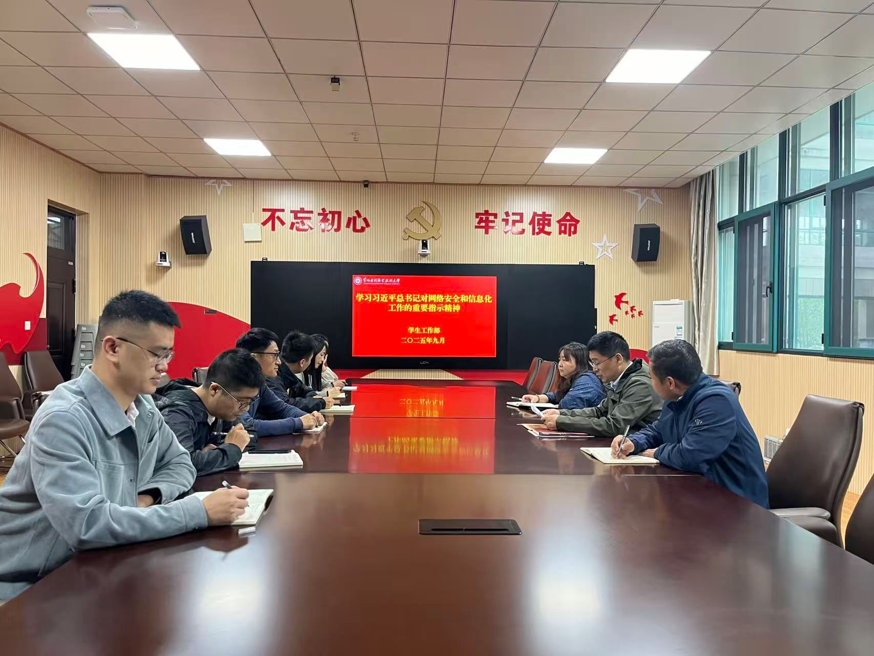 9月23日,学生工作部召开2025年下半年第二次政治理论学习专题会,深入学习习近平总书记对网络安全和信息化工作的重要指示精神,以及《黄河水利职业技术大学2025年度全国文明校园建设工作方案》。会议由学生工作部部长商坤主持,部门全体人员参加,旨在提升部门成员政治素养与业务能力,为学生工作提供更坚实的理论支撑。