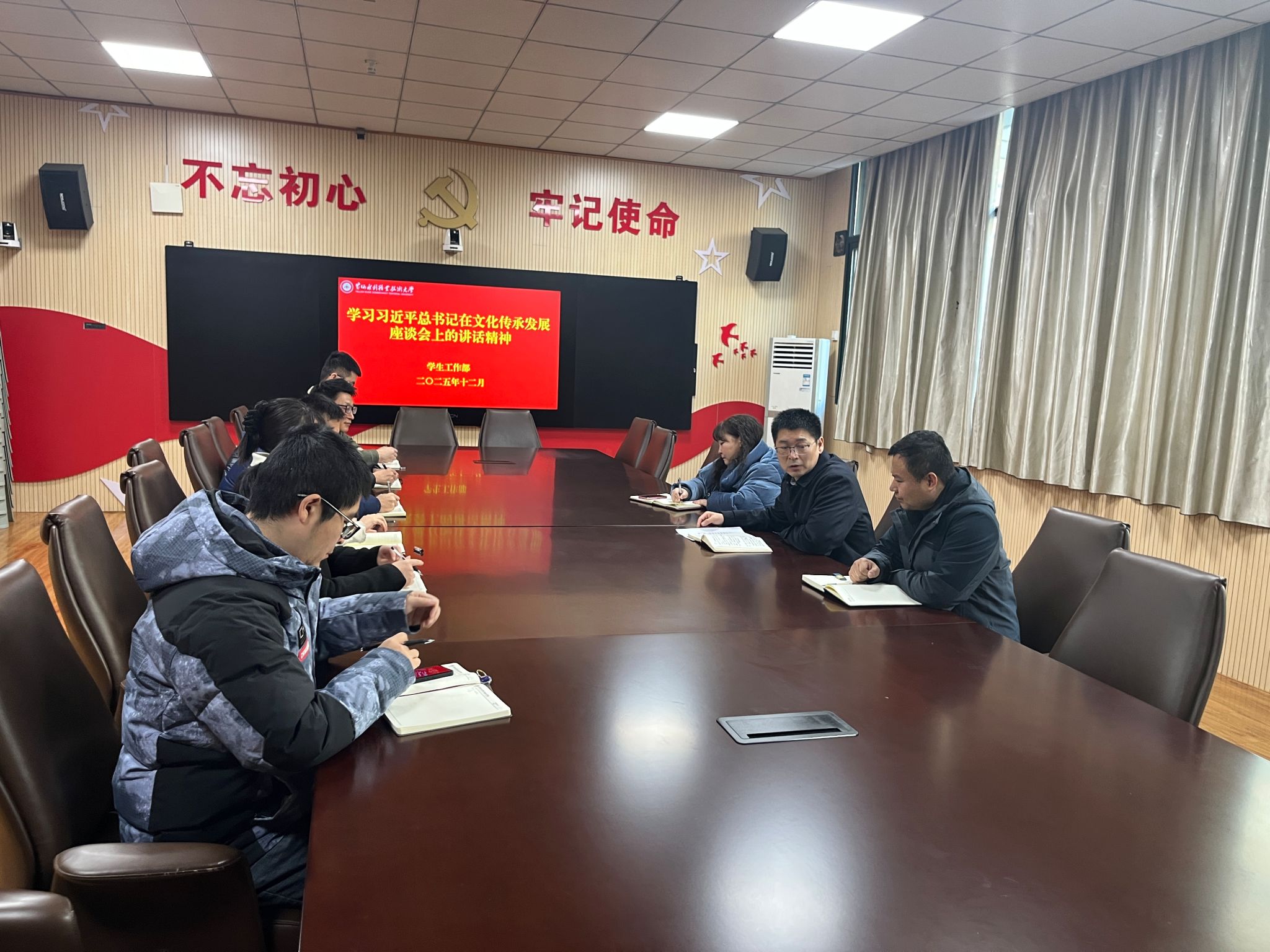 12月30日,为深入贯彻落实重要精神、筑牢思想文化根基,学生工作部召开2025年下半年第八次政治理论学习专题会。此次会议聚焦习近平总书记对宣传思想文化工作作出的重要指示、习近平总书记在文化传承发展座谈会上的讲话以及《习近平文化思想学习纲要》展开深入学习研讨。会议由学生工作部部长商坤主持,部门全体成员参加,旨在深刻领会精神内涵,推动学生工作与文化传承创新深度融合,在新时代文化建设浪潮中展现新担当、新作为。