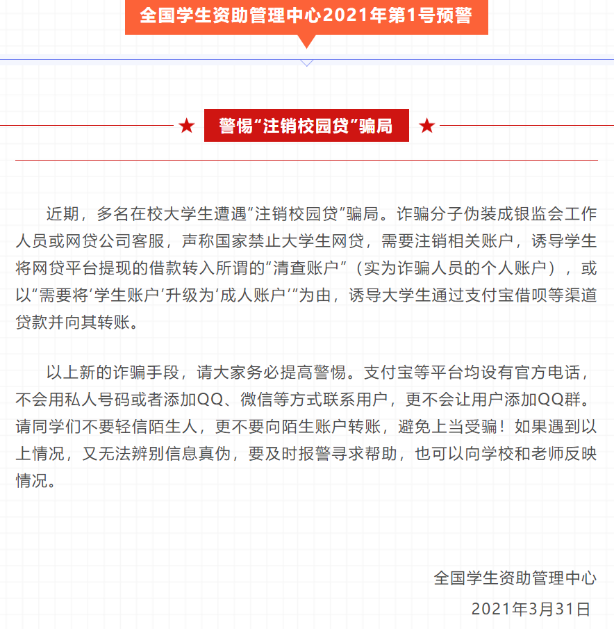 全国学生资助管理中心2021年第1号预警:警惕“注销校园贷”骗局
