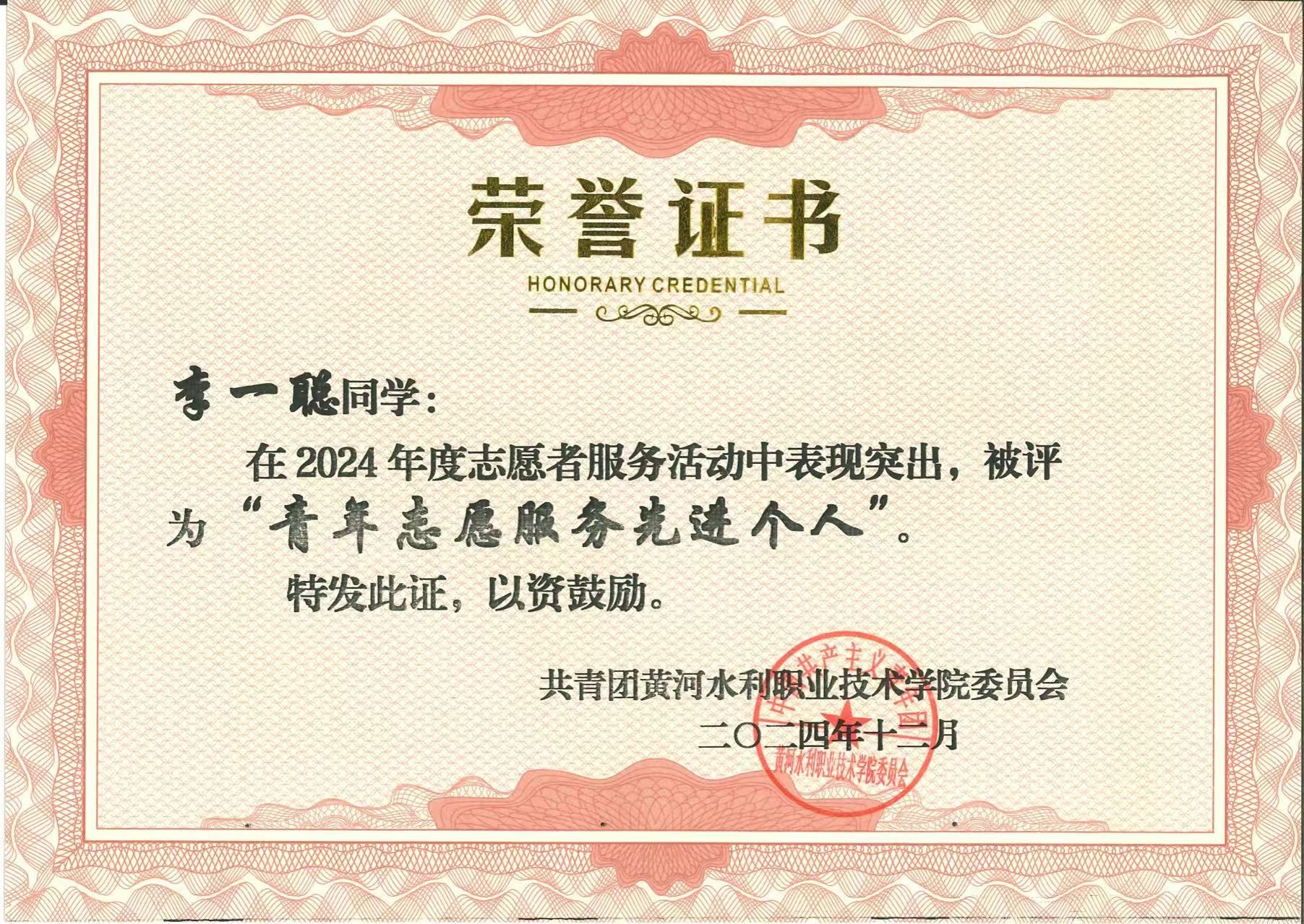 课堂之外,李一聪的青春色彩同样绚丽。在"社彩缤纷·团聚梦想"活动中,他充分发挥创意和组织能力,为活动出谋划策,助力活动成功举办;"诵读中国"经典诵读大赛中,他深情诵读诠释经典,最终荣获三等奖;在“勿忘国耻·振兴中华”主题征文比赛中,他撰写文章抒发爱国情怀,荣获二等奖。更令人动容的是他的志愿情怀:累计服务孤寡老人32小时,在非遗传承活动中手把手教小学生制作泥塑,获评2024年度"青年志愿服务先进个人"。