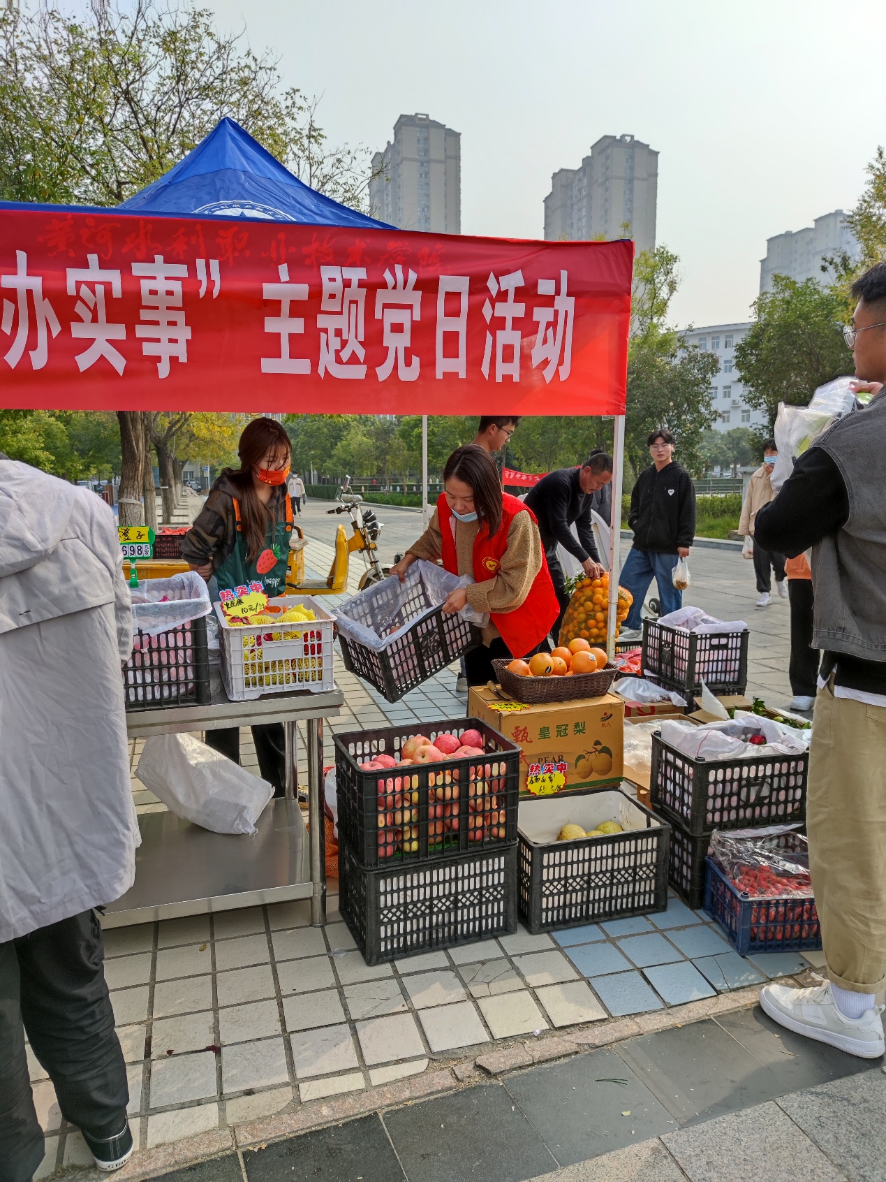 为推动党史学习教育持续走深走实,引导党员干部学党史、悟思想、办实事、开新局,10月26日资产经营管理中心党总支携手生活服务中心鲜果时光等商户,组织开展了“我为群众办实事”主题党日活动,不但进行了“惠生惠师”爱心水果义卖,还向广大师生宣传了疫情防控知识,并发放了防疫用品,用心用情用力服务广大师生,以实际行动践行初心使命,发挥了基层党组织战斗堡垒的作用,获得了师生们的一致好评。