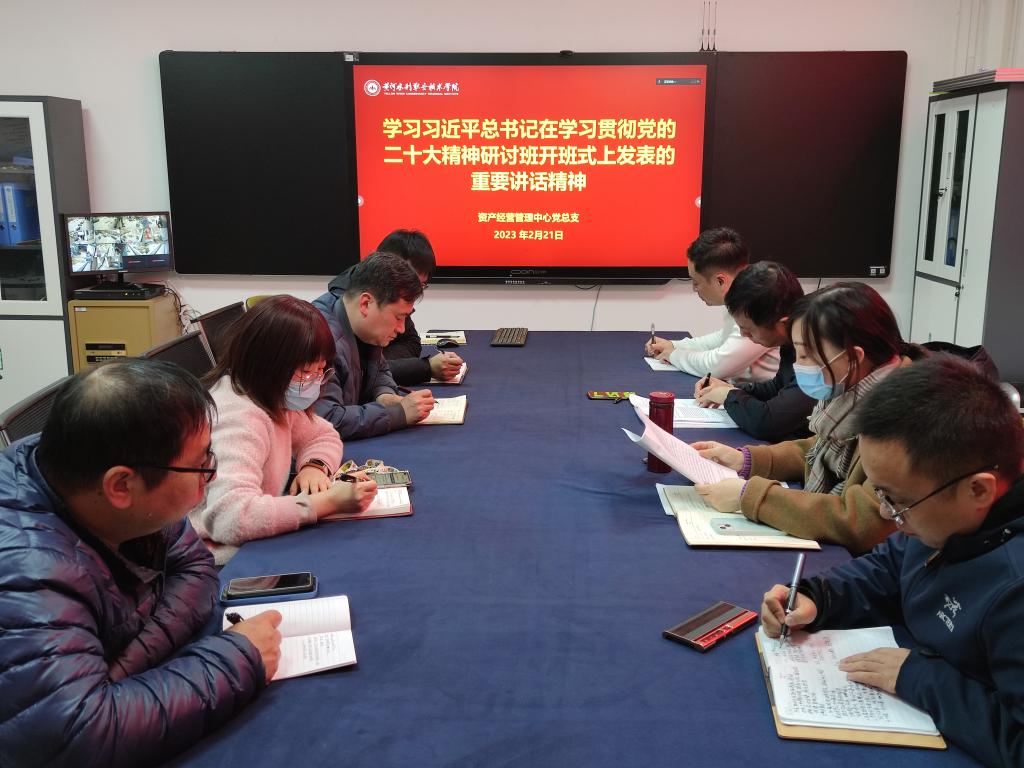 2023年2月21日下午,资产经营管理中心党总支召开会议,认真学习习近平总书记在新进中央委员会的委员、候补委员和省部级主要领导干部学习贯彻习近平新时代中国特色社会主义思想和党的二十大精神研讨班开班式上的重要讲话精神,和传达永利官网2023年新学期工作会议精神。会议由资产经营管理中心党总支书记鄢彬彬主持,全体党员参会。