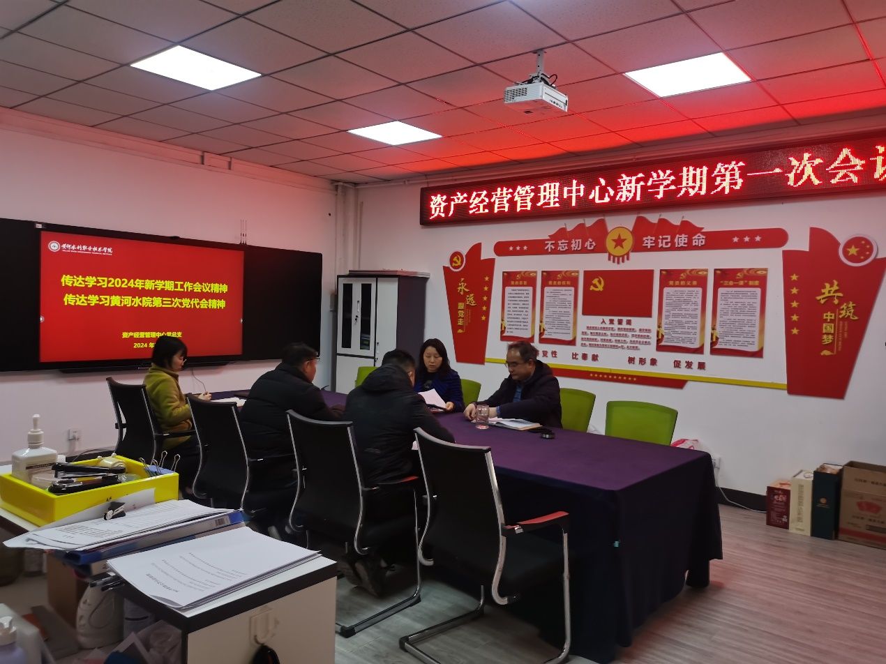 35日资产经营管理中心组织召开2024年春季新学期第一次会议,会议由资产经营管理中心党总支书记赵彦华主持,资产经营管理中心主任周晓峰及全体人员参会。