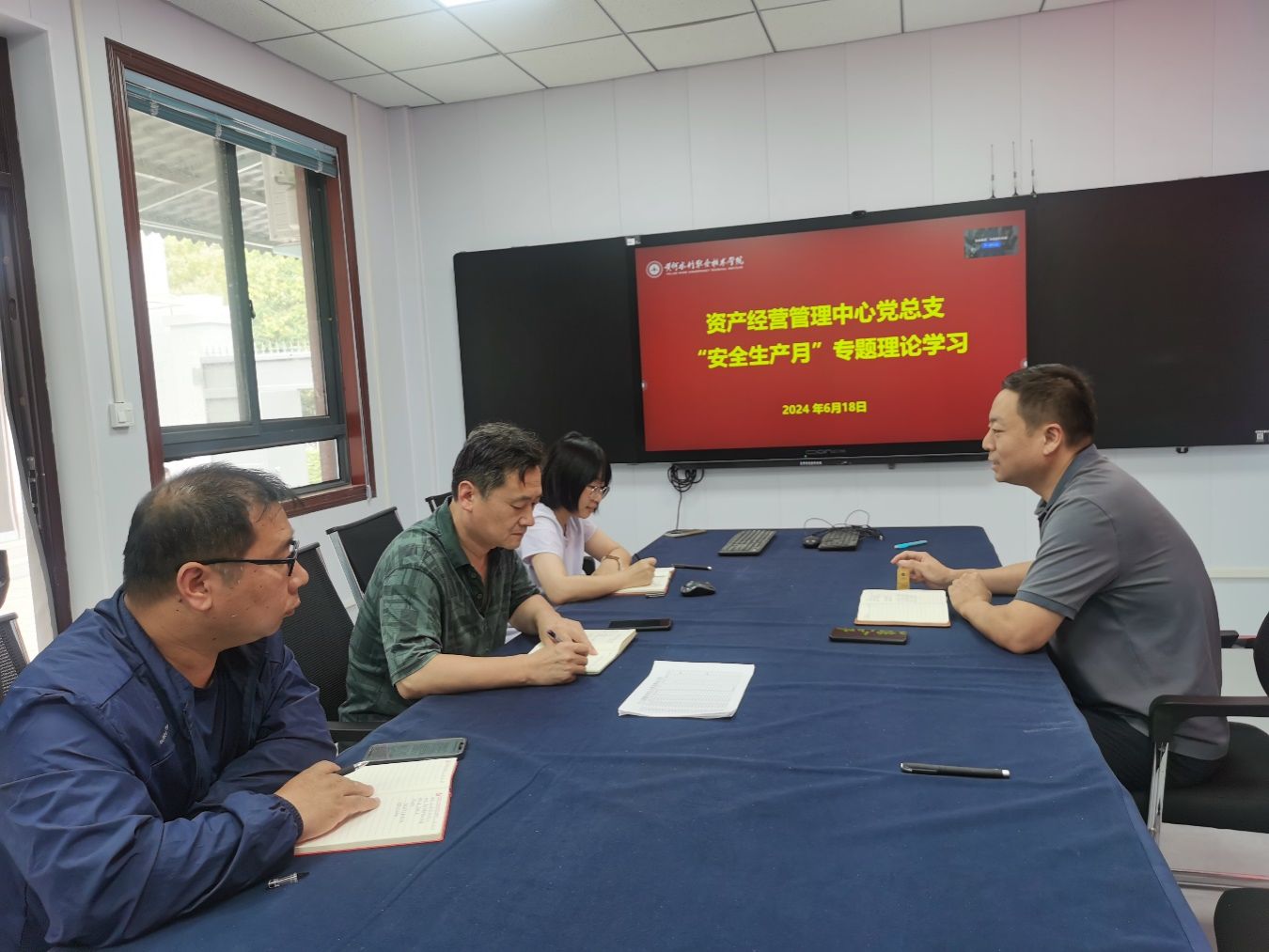2024 6 18 日下午,资产经营管理中心党总支在部门会议室召开了“安全生产月”专题理论学习会议。本次会议由二支部书记关震主持。