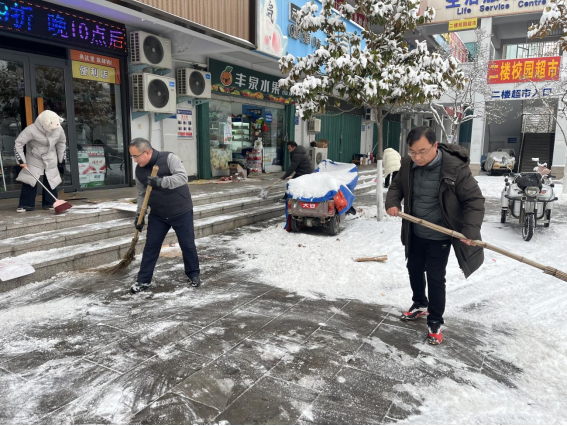 在领导班子带领下,全体党员不畏严寒、分工协作,重点对商铺门前、人行通道、台阶坡道等重点区域进行清扫。尽管清扫工具不足,但大家“没有条件创造条件”,自制推雪板、利用废旧板材,铁锹、扫帚、簸箕齐上阵,还借助商户闲置推车清运积雪。现场热火朝天,党员们躬身为桥、挥汗成帚,在冰天雪地中勾勒出一幅生动的“除雪作战图”。